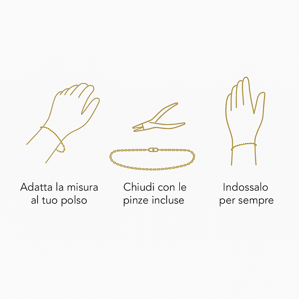 Ogni box racchiude due bracciali permanenti, due chiusure e due pinze eleganti per regolarli alla perfezione.