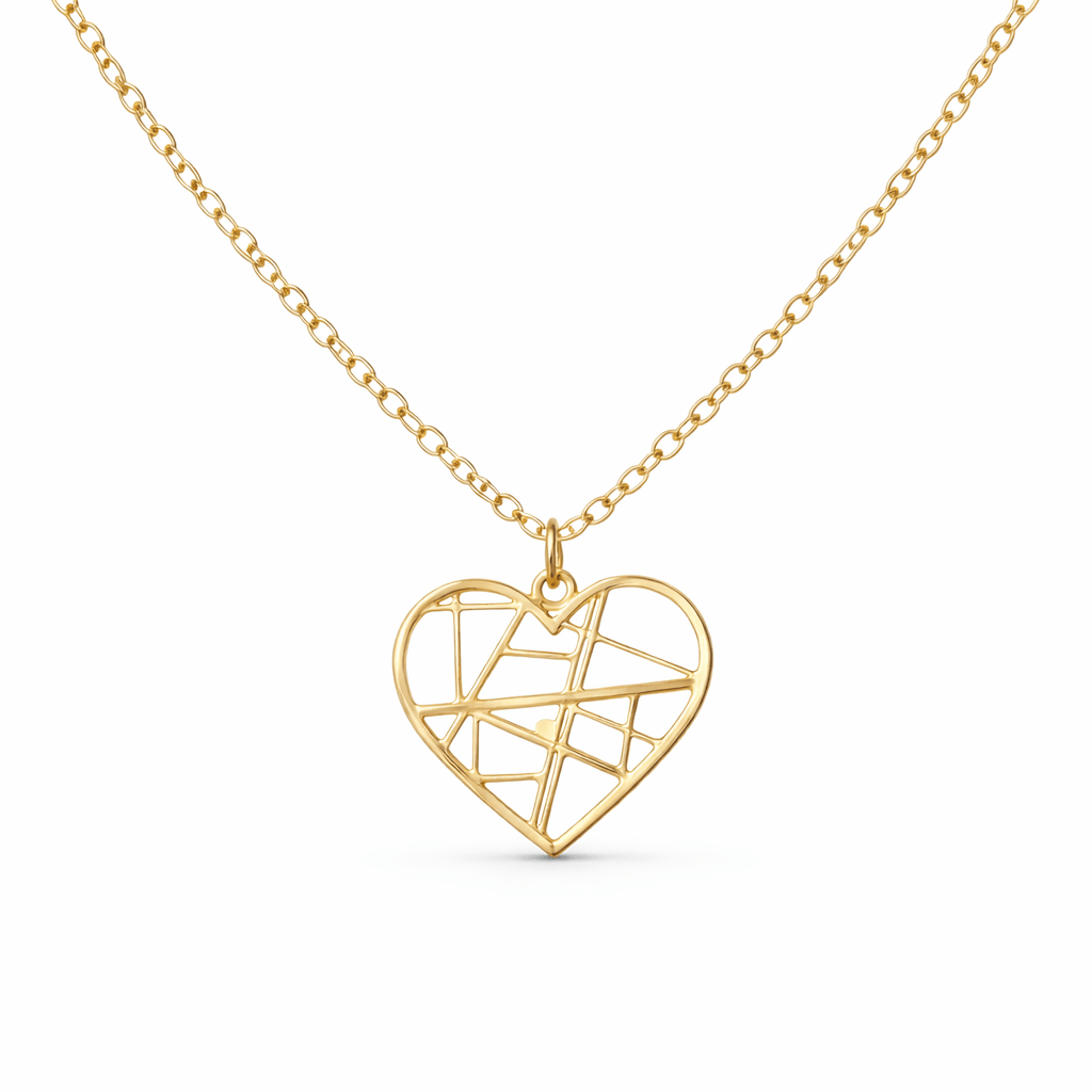 Questa collana con mappa del cuore unisce linee moderne e forme armoniose in un design elegante e leggero. Le geometrie interne creano un effetto raffinato e contemporaneo, trasformando il cuore in un simbolo personale da indossare ogni giorno.